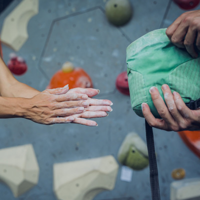 Die Kletterer haben meist einen Beutel mit Talkum bei sich. Damit schützen sie die Haut ihrer Hände und machen sie griffsicherer.